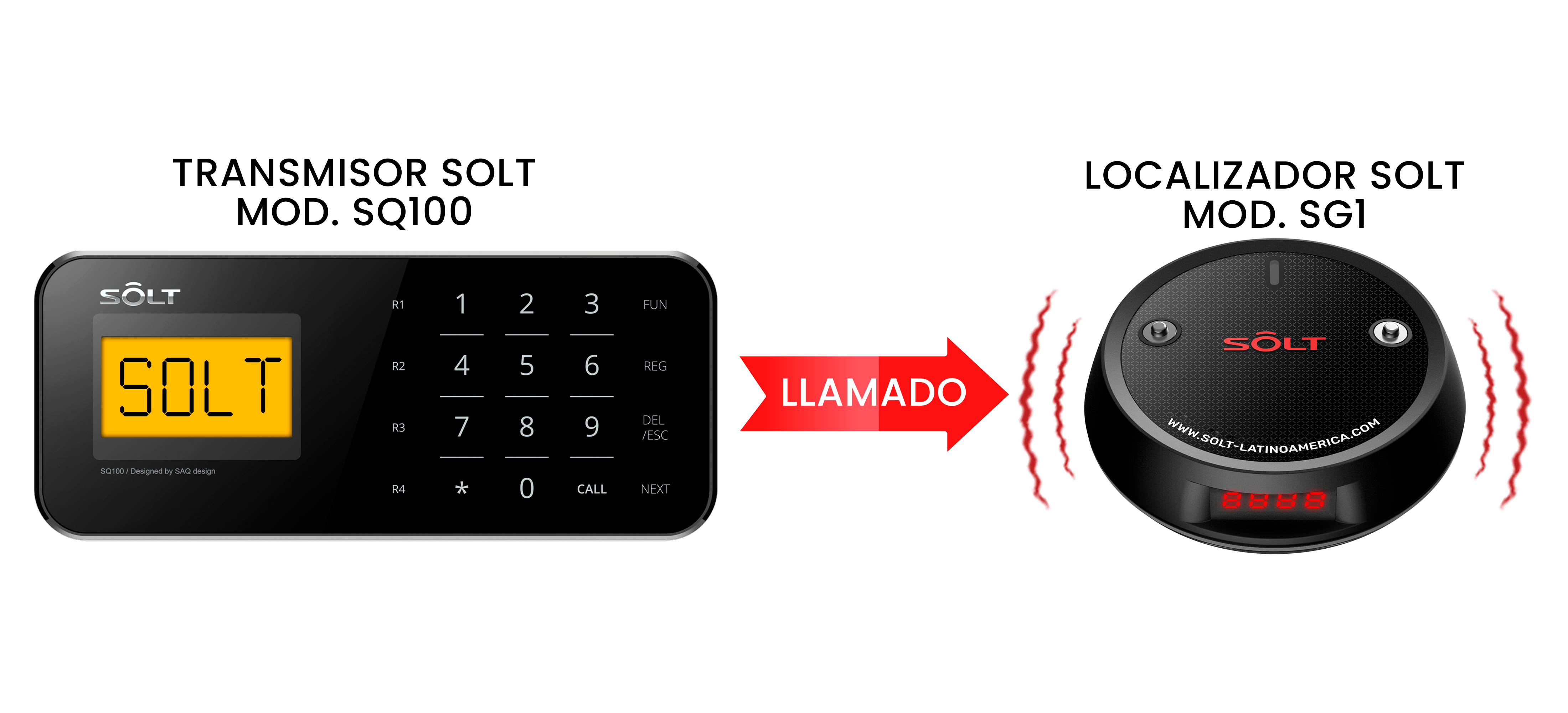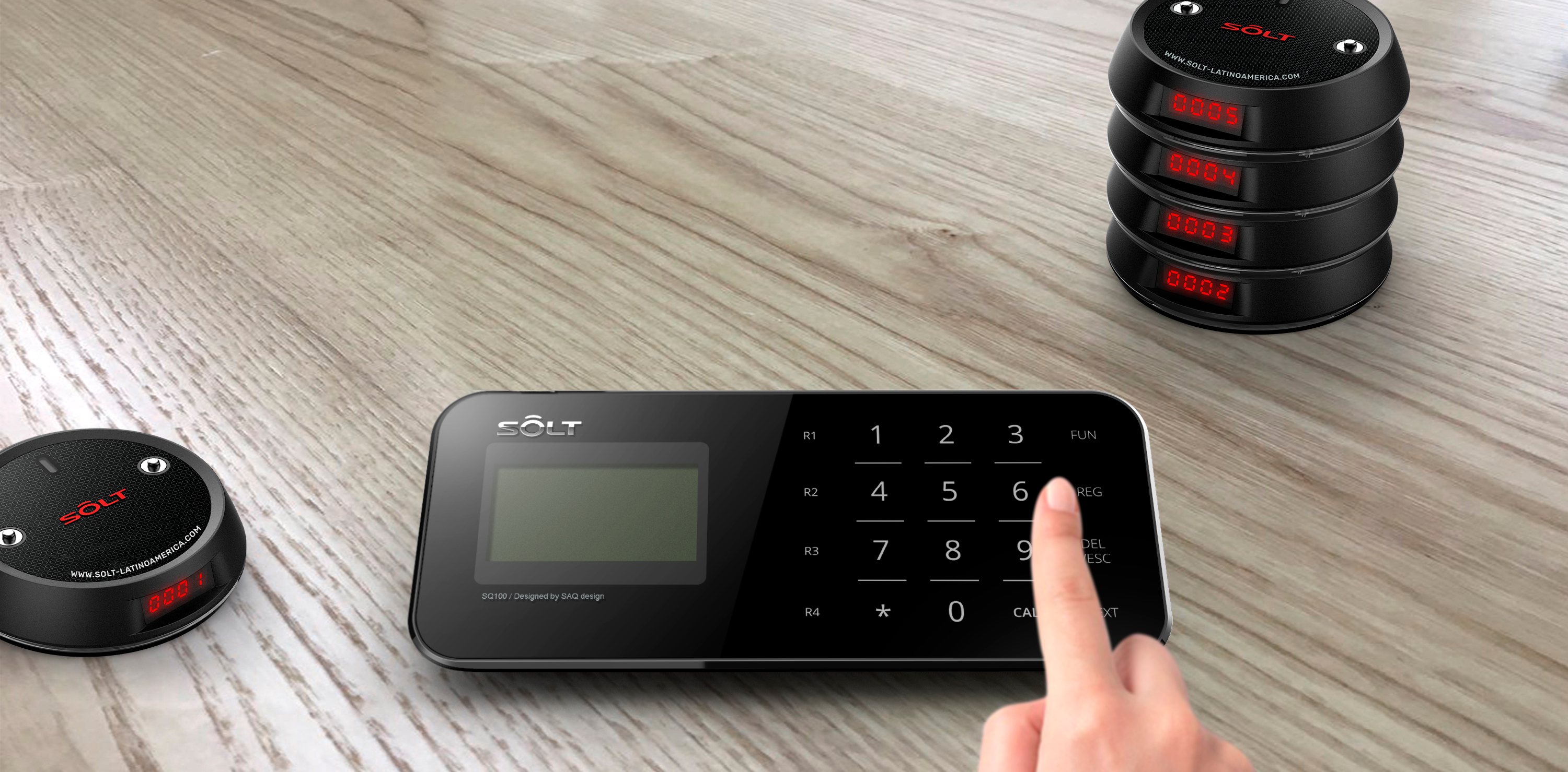 El transmisor SOLT Mod. SQ100 de teclado táctil está diseñado para enviar alertas de llamado a los localizadores SOLT Mod. SG1.